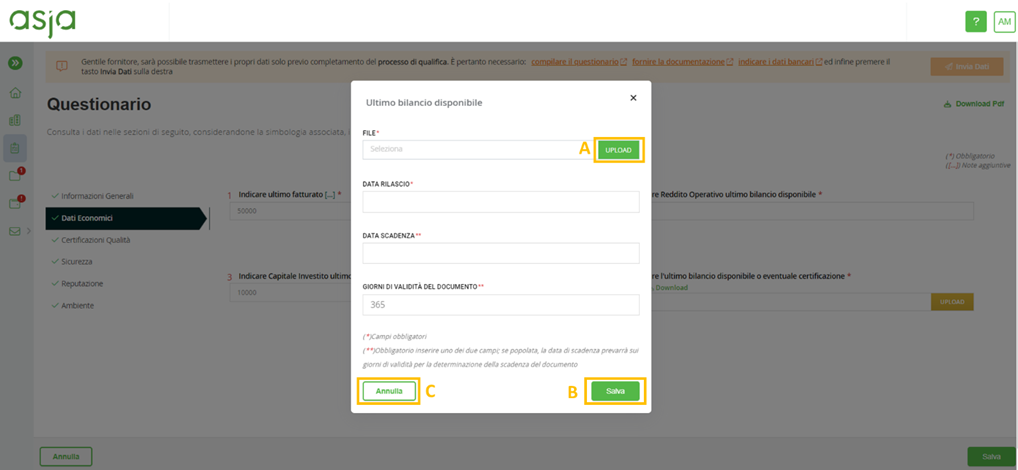 Durante la compilazione dei questionari, al fornitore verrà chiesto di allegare dei documenti (obbligatori e non) (rif. Figura 14). Per allegare un documento, all’apertura del relativo pop-up, è necessario cliccare sul pulsante Upload (A) ed inserire la data di rilascio della documentazione in oggetto. Al fine di salvare l’inserimento del documento, il fornitore dovrà procedere cliccando sul pulsante Salva (B); al contrario qualora volesse tornare indietro senza salvare l’inserimento, utilizzare il tasto Annulla (C) (rif. Figura 14)