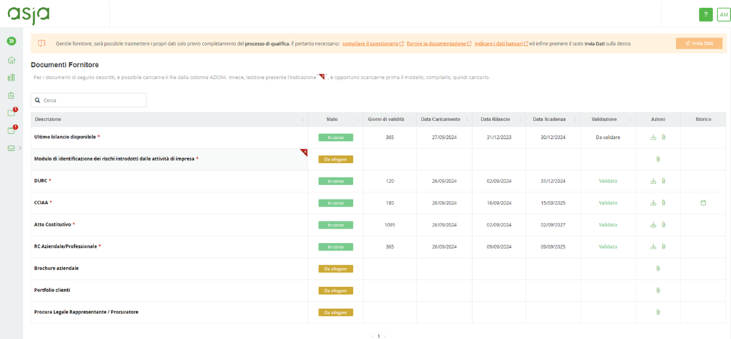 • caricare i documenti che, seppure non obbligatori, sono di forte rilevanza per la propria qualifica all’interno dell’albo fornitori di Asja.