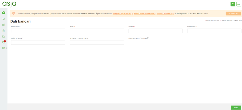 All’interno dei moduli, i campi contrassegnati con un asterisco (*) sono campi obbligatori; tuttavia, si consiglia di compilare tutti i campi, al fine di fornire ad Asja più dati possibili dell’azienda fornitrice.