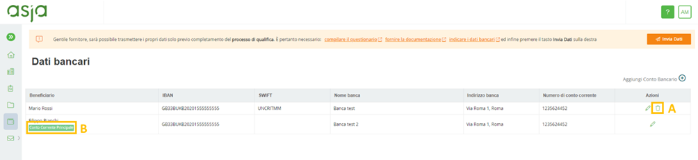 Nel caso in cui siano stati censiti più IBAN, sarà possibile cancellarne uno o più di uno (A) (Rif. Figura 18) a patto che questo non sia contrassegnato come “Conto Corrente Principale” (B) (rif. Figura 18).
