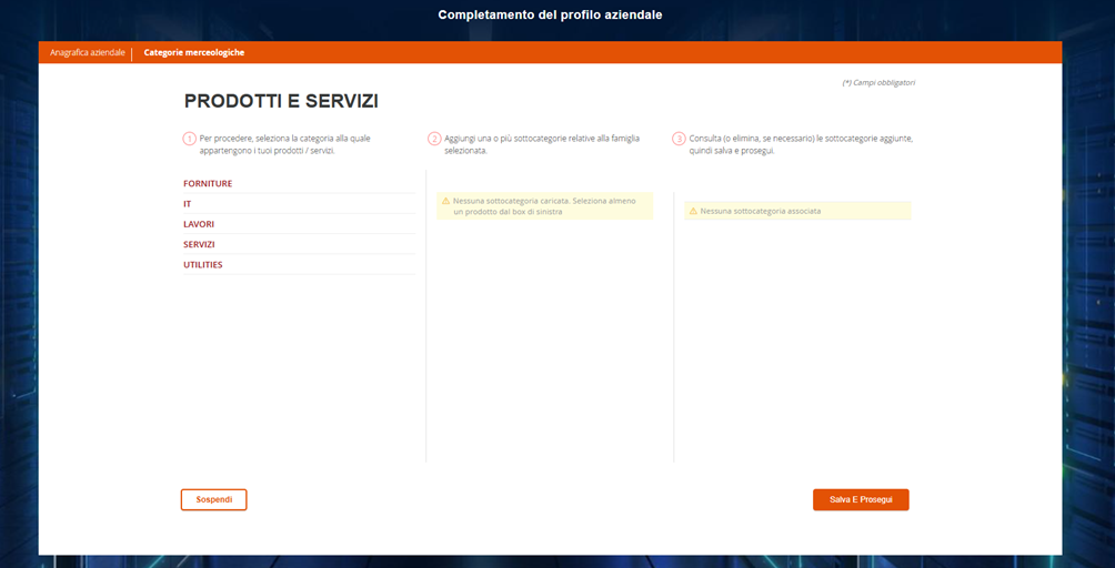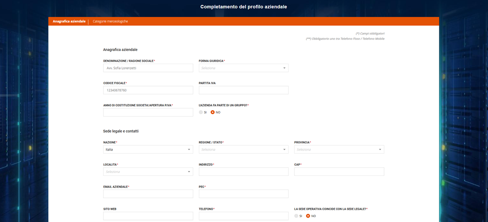 Al fine di completare il processo di registrazione, il fornitore deve procedere con la compilazione dei vari moduli, necessari ad inquadrare il profilo aziendale.