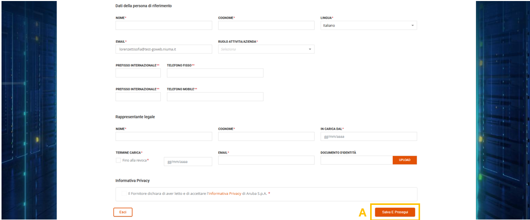 Dopo aver compilato tutti i campi, per procedere con la registrazione, cliccare su Salva e prosegui (A) (in basso a destra – rif. Figura 3).
