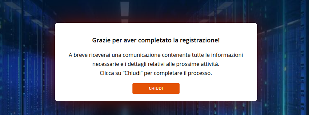 Se tutto il procedimento di registrazione è andato a buon fine, si aprirà la pagina (rif. Figura 8) contenente la seguente dicitura: “Grazie per aver completato la registrazione! A breve riceverai una comunicazione contenente tutte le informazioni necessarie e i dettagli relativi alle prossime attività. Clicca su “Chiudi” per completare il processo.”