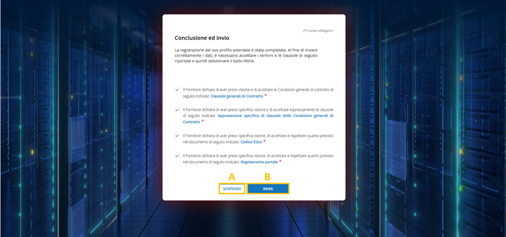 Una volta selezionata la voce, fare click su Invia (A) per terminare la registrazione (rif. Figura 6). Qualora l’utente clicchi sul pulsante Sospendi (B), il sistema sospenderà il flusso di registrazione del fornitore, che potrà terminarlo in un secondo momento utilizzando il token.