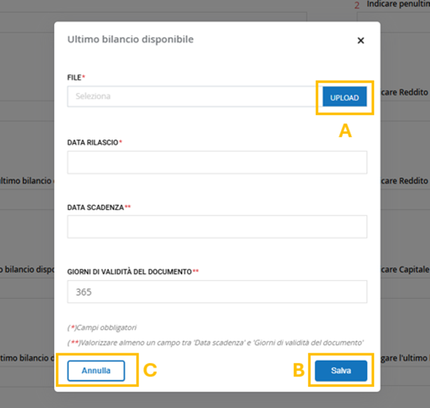 Per allegare un documento, all’apertura del relativo pop-up, è necessario cliccare sul pulsante Upload (A) ed inserire la data di rilascio della documentazione in oggetto. Al fine di salvare l’inserimento del documento, il fornitore dovrà procedere cliccando sul pulsante Salva (B); al contrario qualora volesse tornare indietro senza salvare l’inserimento, utilizzare il tasto Annulla (C) (rif. Figura 6)