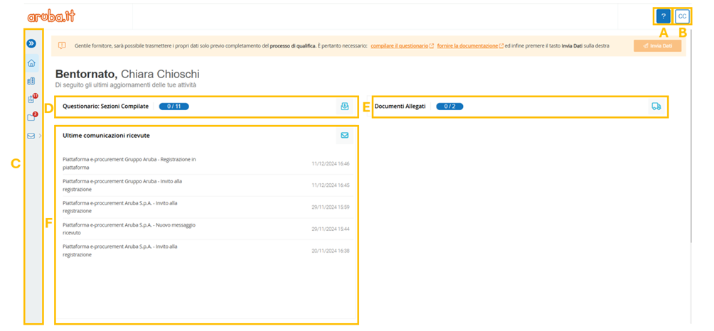 - Menu principale (C): attraverso tale menu, il fornitore può visualizzare e modificare i dati dell’azienda, i questionari, i documenti, i propri dati bancari e le comunicazioni ricevute.