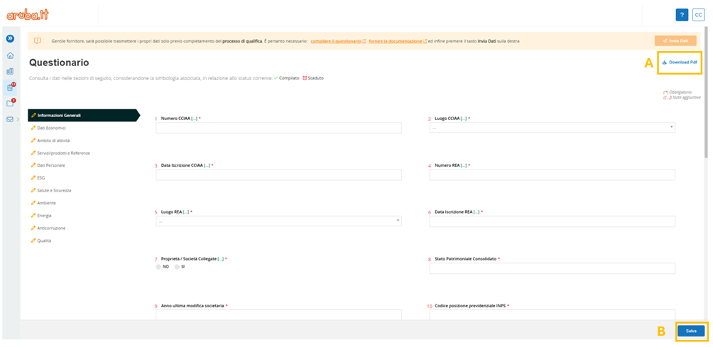 Qualora il fornitore abbia bisogno di scaricare il file relativo al questionario, potrà cliccare sul pulsante “Download pdf” (A) presente all’interno di ogni pagina del questionario.
