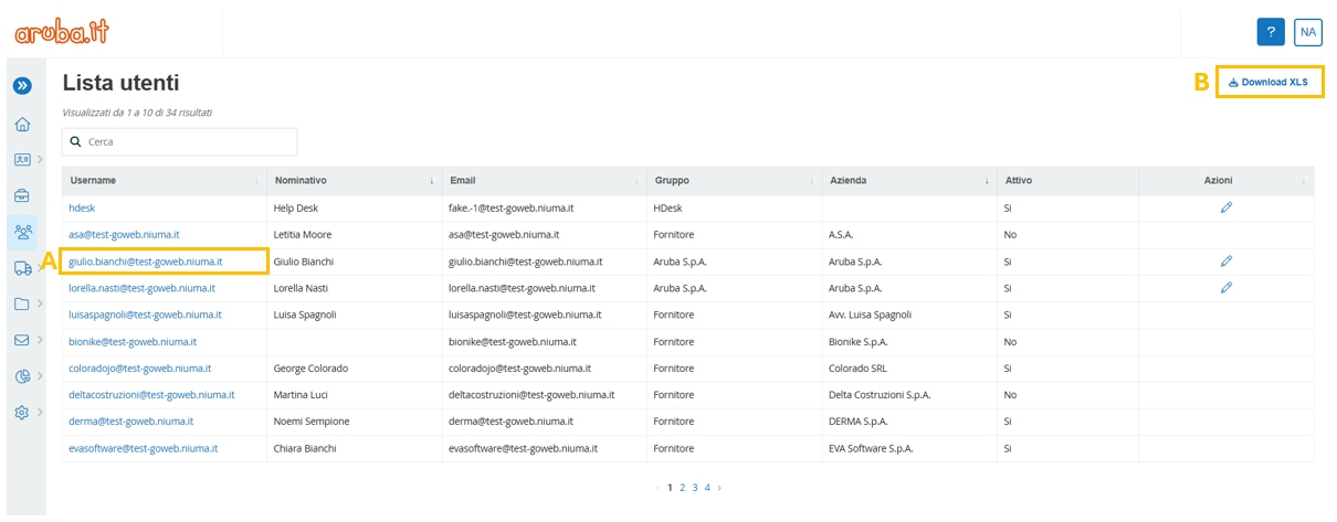 Il sistema permette all’utente di fare un’estrazione di tutti gli utenti censiti sul portale, cliccando sul pulsante “Download XLS” (B).
