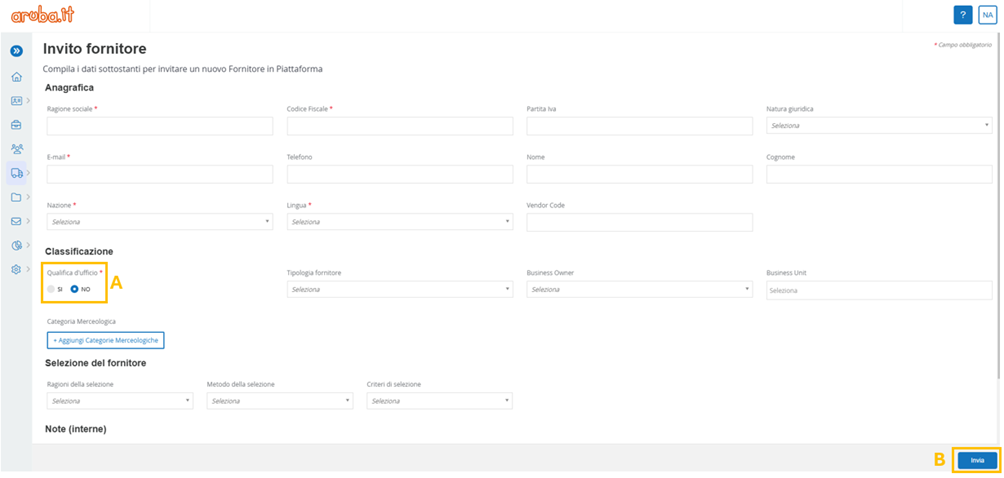- Invito alla registrazione: questa sezione consente di invitare un determinato fornitore a registrarsi sul portale tramite il pulsante “Invia” (B) in basso a destra della pagina (rif. Figura 5). In particolare, una volta inseriti i dati richiesti, specialmente quelli obbligatori contraddistinti da (*), il sistema invierà una mail al fornitore con la relativa comunicazione. Nella mail sarà contenuto il codice “token”, un codice alfanumerico di ristretta validità temporale, che consentirà al fornitore di poter accedere alla procedura di registrazione al portale di e-procurement.