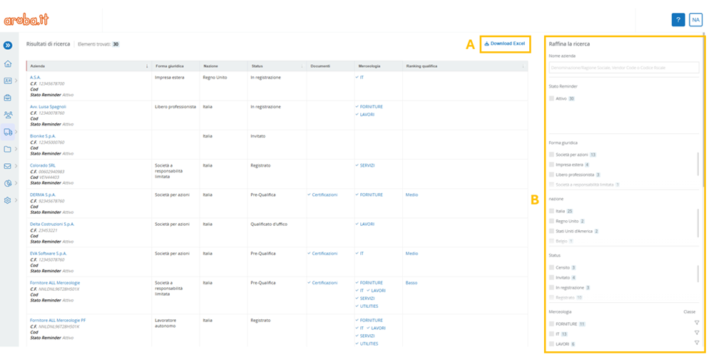 In aggiunta, l’utente interno ha la possibilità di effettuare un’estrazione dei fornitori, cliccando sul pulsante “Download Excel” (A), situato in alto a destra della pagina; con l’eventualità di poter effettuare una selezione dei fornitori utilizzando lo strumento del filtro di ricerca (C).