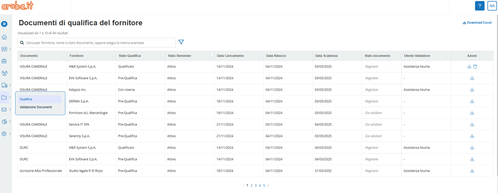 - Qualifica: questa sezione contiene tutti i documenti caricati sul portale di e-procurement dal fornitore. L’elenco associa ad ogni documento presente nel portale: il fornitore dal quale è stato caricato, lo stato di qualifica del fornitore, la data di caricamento del documento a sistema, la data in cui il documento è stato rilasciato al fornitore, la data di scadenza del documento, lo stato, l’utente che ha validato il documento e lo stato reminder.