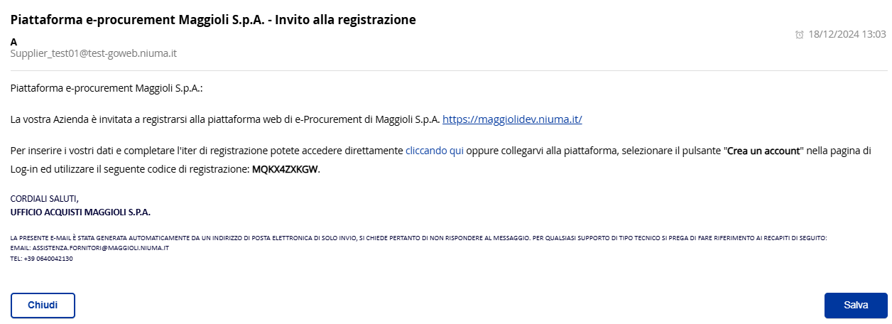 1. ln caso di richiesta registrazione pervenuta via email(Figura 1) recuperare il codice di accesso dal testo email: