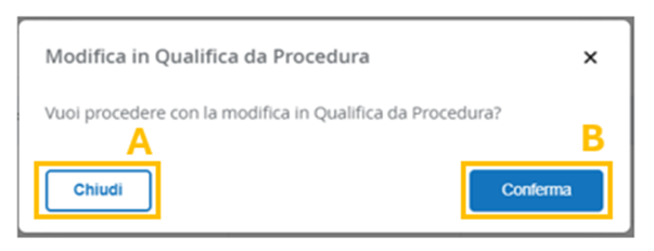 Al contrario, se il fornitore presenta una o più categorie merceologiche, in pagina viene visualizzato un pop-up per confermare l’azione. Al click su “Chiudi” (A), il pop up si chiude in pagina senza assegnare alcuna qualifica. Al click su “Conferma” (B) (rif. Figura 4) invece, il sistema indirizza il fornitore automaticamente nella “Vendor List” con stato “Qualifica da procedura”.